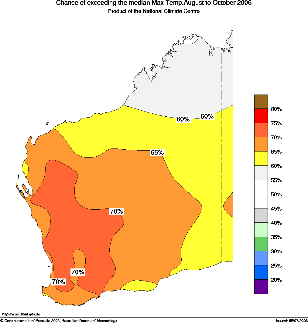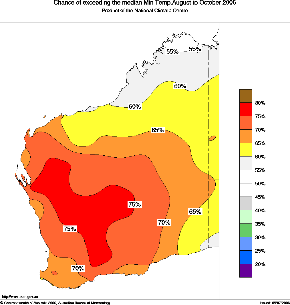 WA Seasonal Temperature Outlook: probabilities for August to October 2006, issued 25th July 2006 | ||||