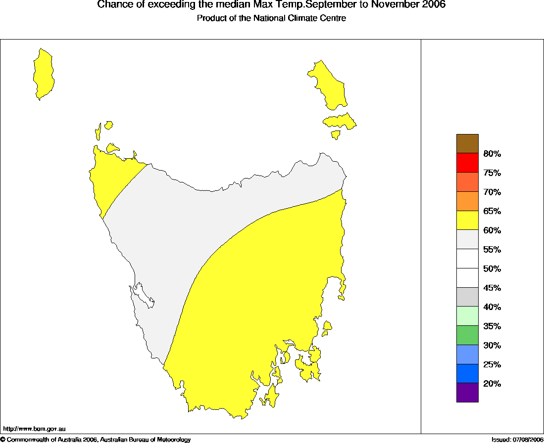 Tas Seasonal Temperature Outlook: probabilities for Spring 2006, issued 23rd August 2006 | ||||