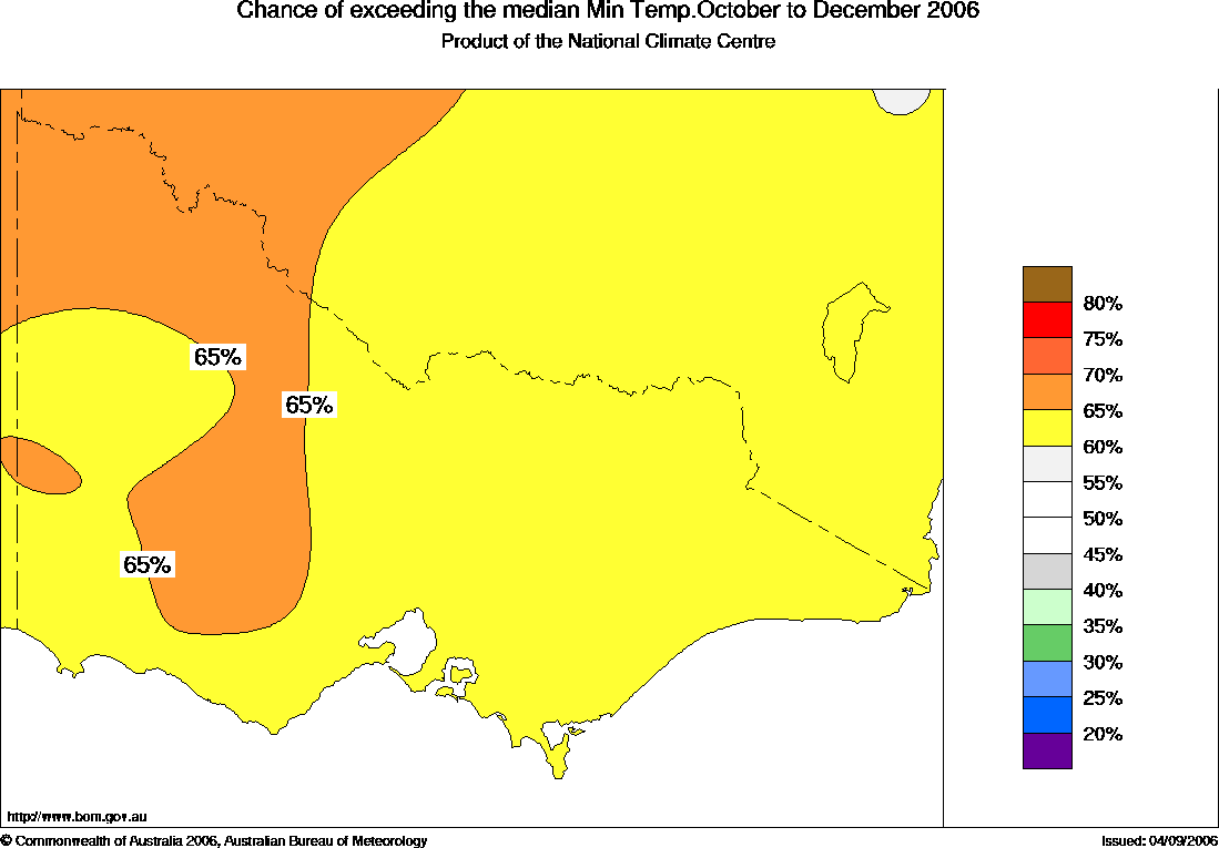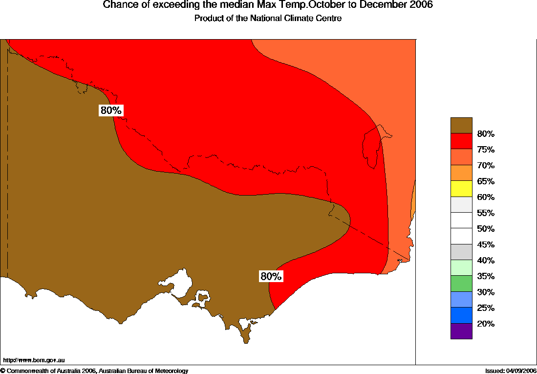 Vic Seasonal Temperature Outlook: probabilities for October to December 2006, issued 26th September 2006 | ||||