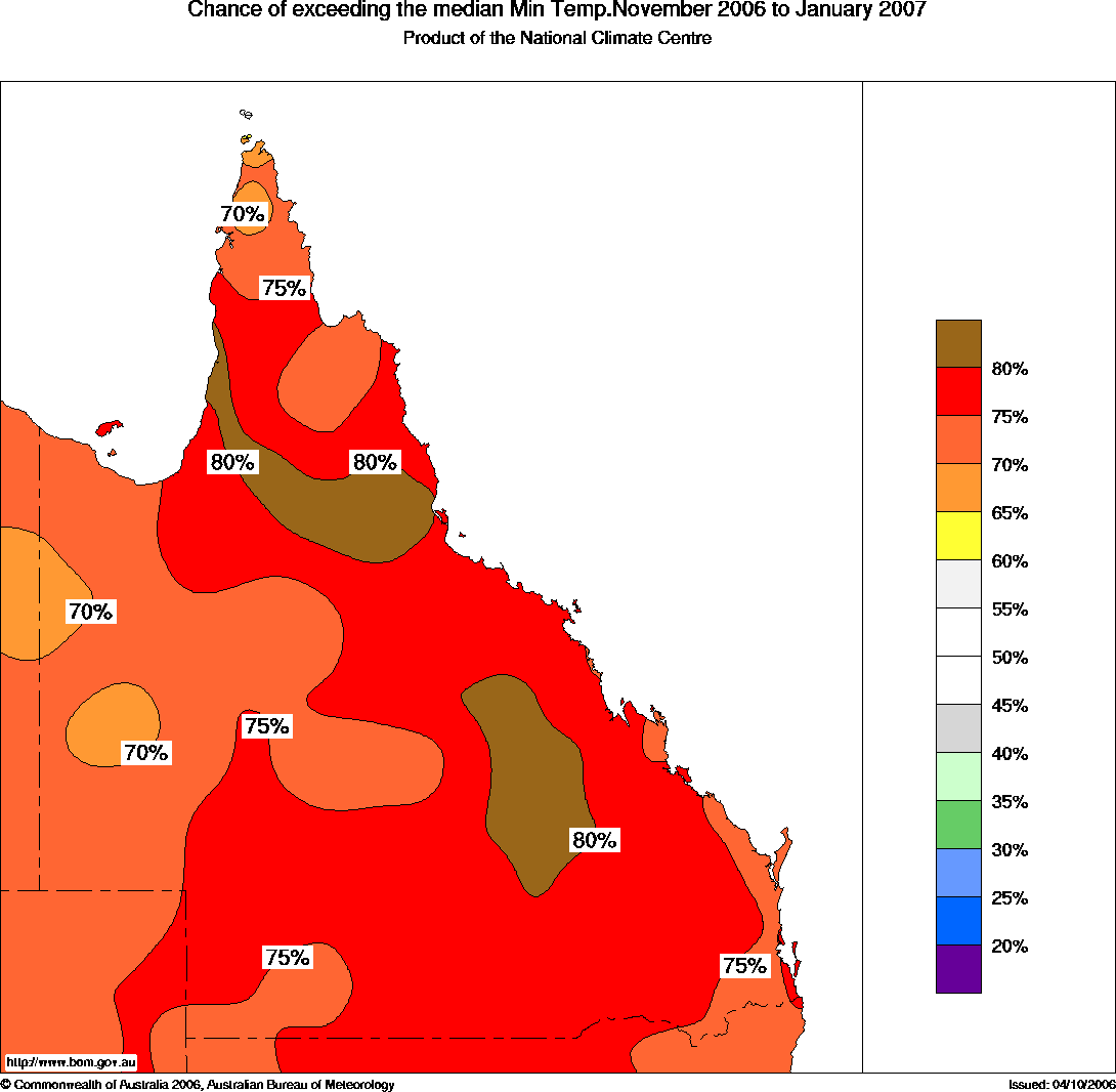 Qld Seasonal Temperature Outlook: probabilities for November 2006 to January 2007, issued 26th October 2006 | ||||