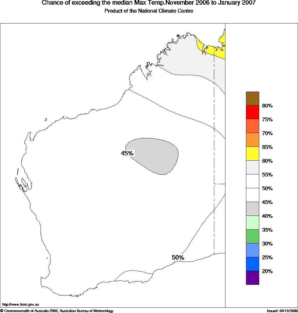 50:50 chances for a warm start to summer in WAThe current seasonal temperature odds do not strongly favour either warmer or cooler than average conditions. Therefore, the chances of exceeding the median maximum temperature for the November to January period are close to 50% throughout Western Australia, the Bureau of Meteorology announced today.