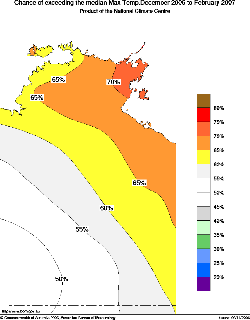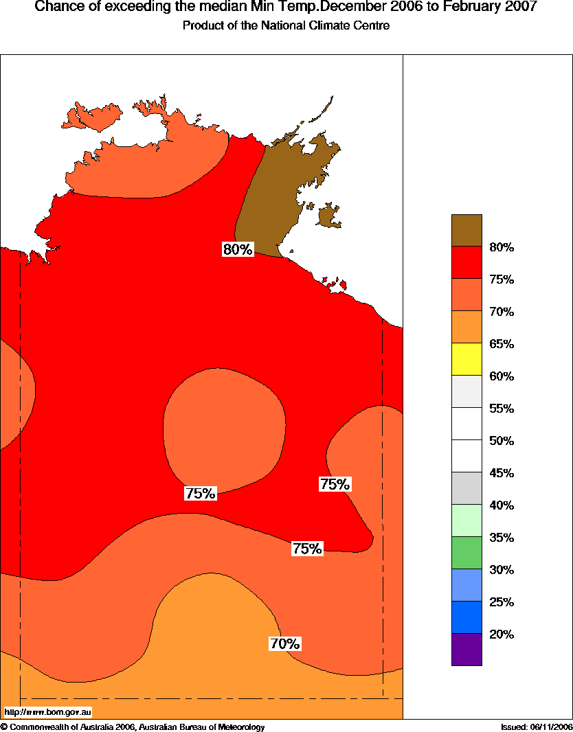 More information on this outlook is available from 9.00am to 5.00pm (CST) Monday to Friday by contacting the Climate and Consultancy section in the Bureau's Darwin Office: (08) 8920 3813. | ||||