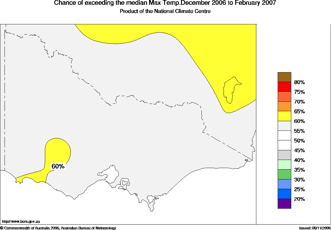Vic Seasonal Temperature Outlook: probabilities for Summer 2006/2007, issued 23rd November 2006 | ||||