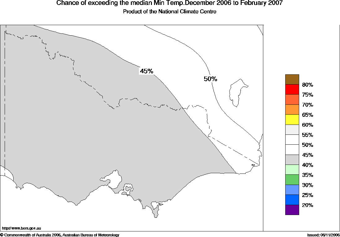 More information on this outlook is available from 9.00am to 5.00pm (EST) Monday to Friday by contacting the Climate and Consultancy section in the Bureau's Victorian Regional Office: (03) 9669 4949. | ||||