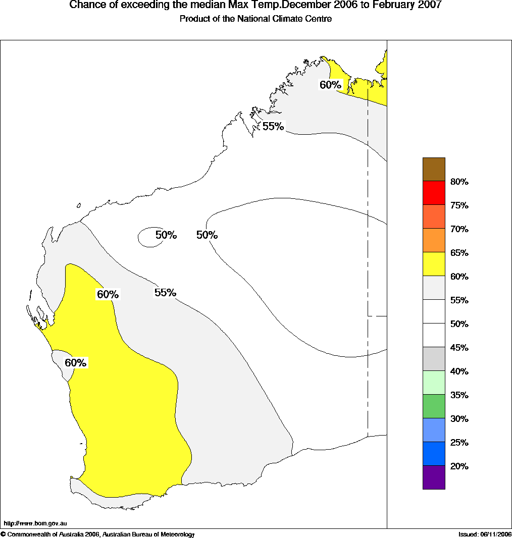 WA Seasonal Temperature Outlook: probabilities for Summer 2006/2007, issued 23rd November 2006 | ||||