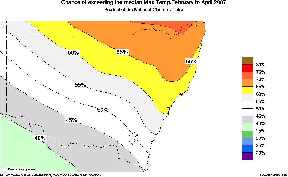 NSW Seasonal Temperature Outlook: probabilities for February to April 2007, issued 23rd January 2007 | ||||