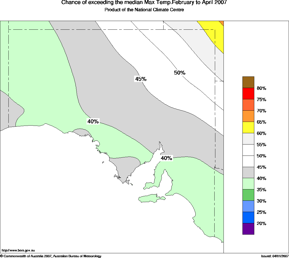 Cooler season from northwest to southeast SAThe temperature outlook for the February to April period shows that below average maximum temperatures are favoured in a band stretching from northwest South Australia to the southeast of the State. The pattern of seasonal temperature odds across the State is mostly due to higher than average temperatures the Pacific Ocean (because of El Niño).
