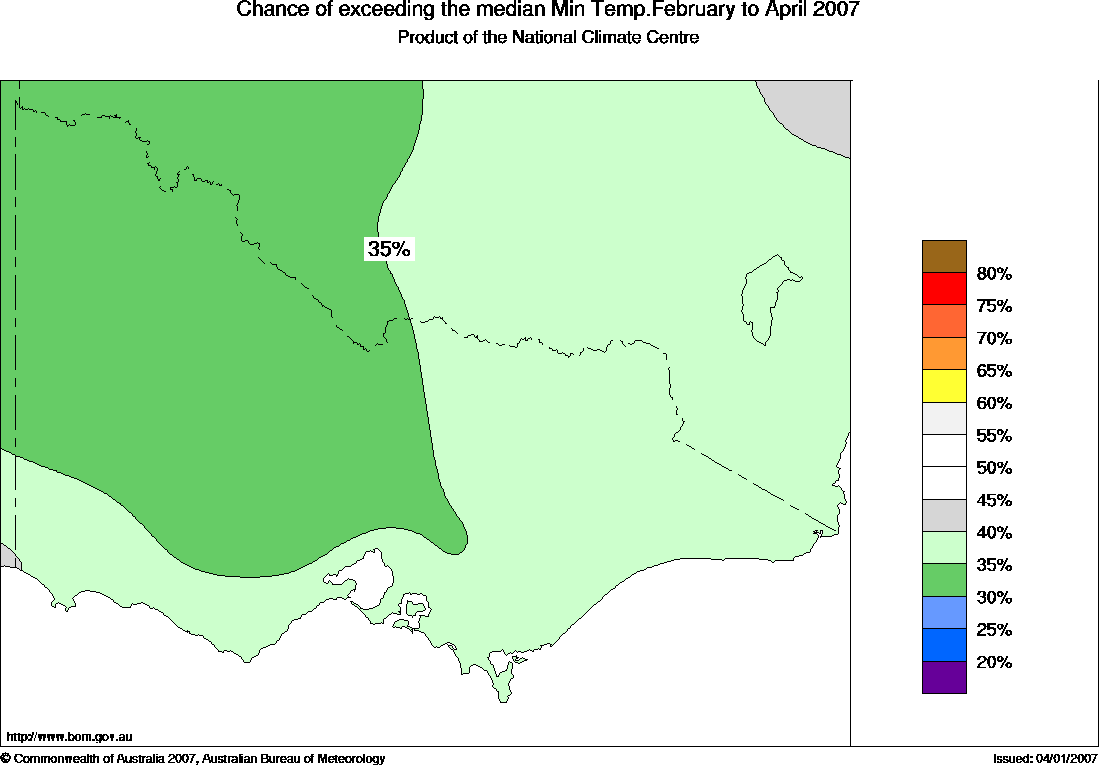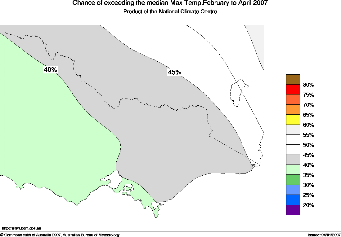 Vic Seasonal Temperature Outlook: probabilities for February to April 2007, issued 23rd January 2007 | ||||