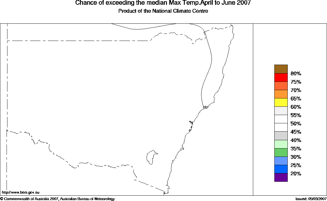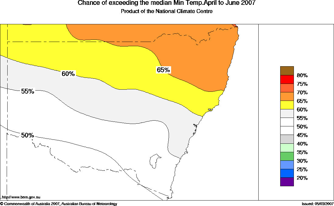NSW Seasonal Temperature Outlook: probabilities for April to June 2007, issued 26th March 2007 | ||||