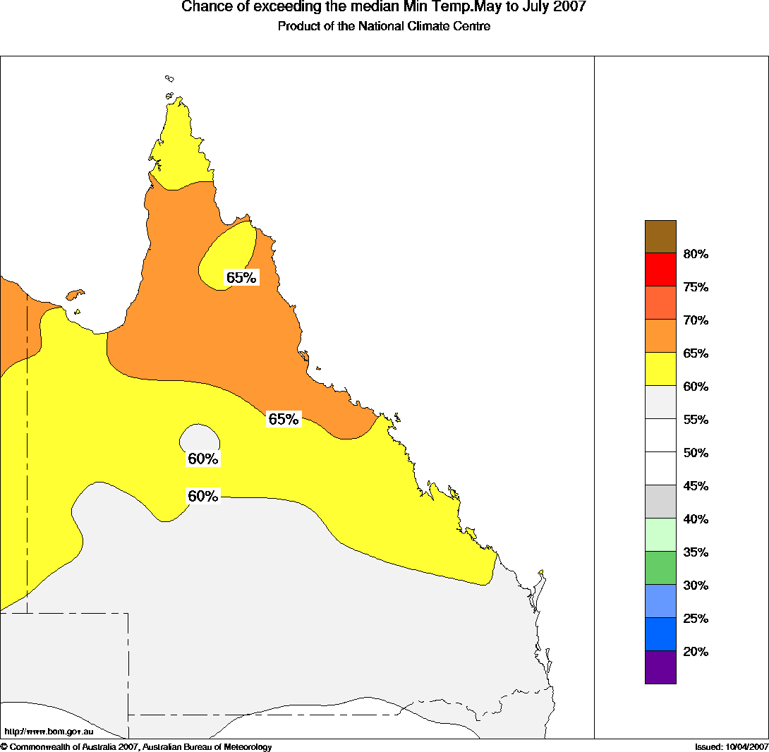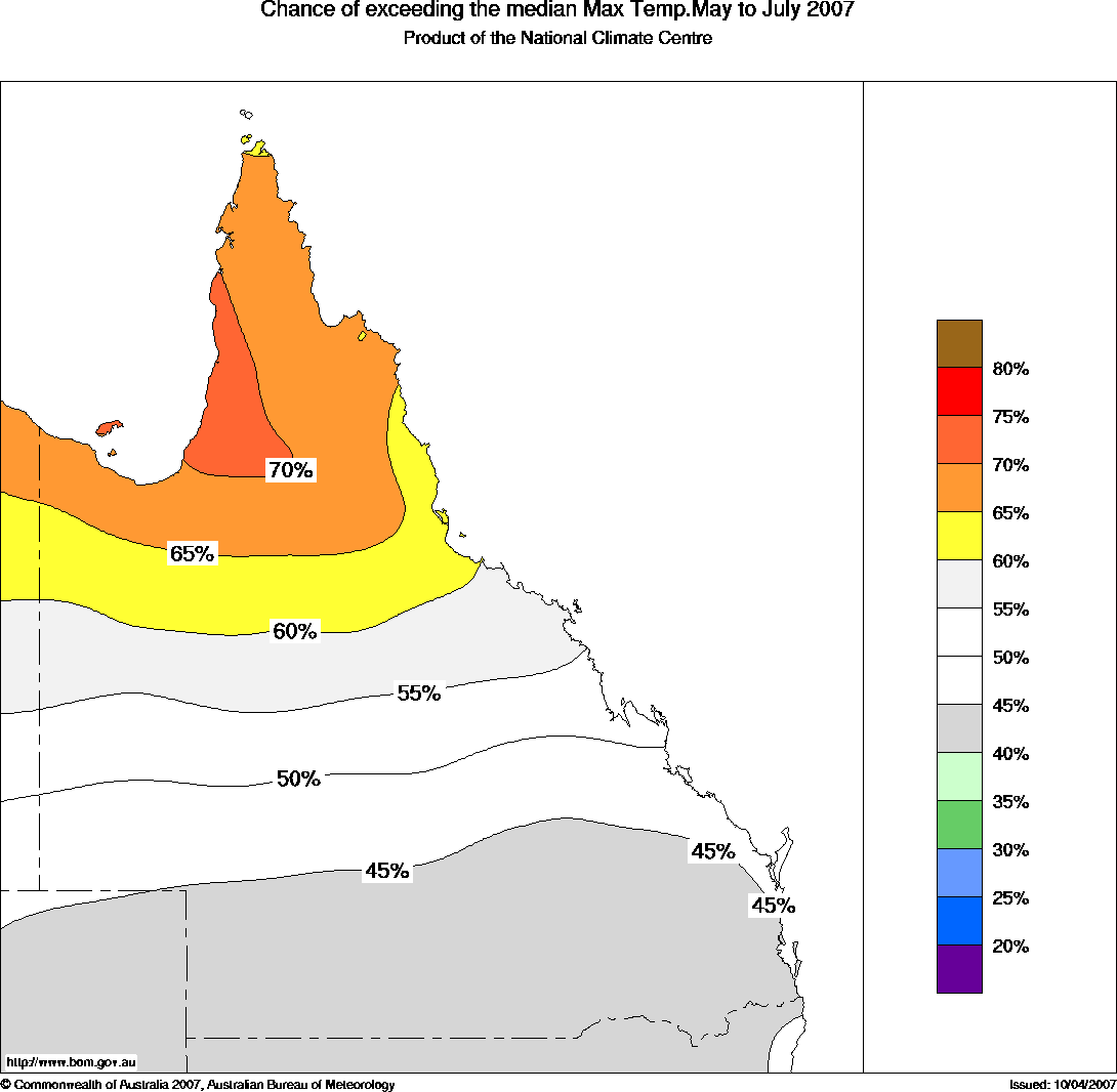 Qld Seasonal Temperature Outlook: probabilities for May to July 2007, issued 23rd April 2007 | ||||