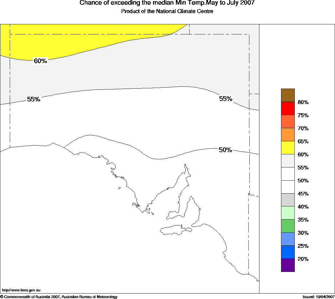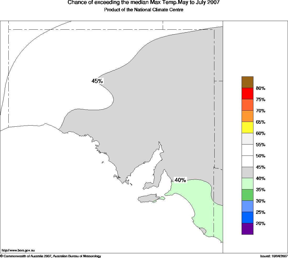 SA Seasonal Temperature Outlook: probabilities for May to July 2007, issued 23rd April 2007 | ||||