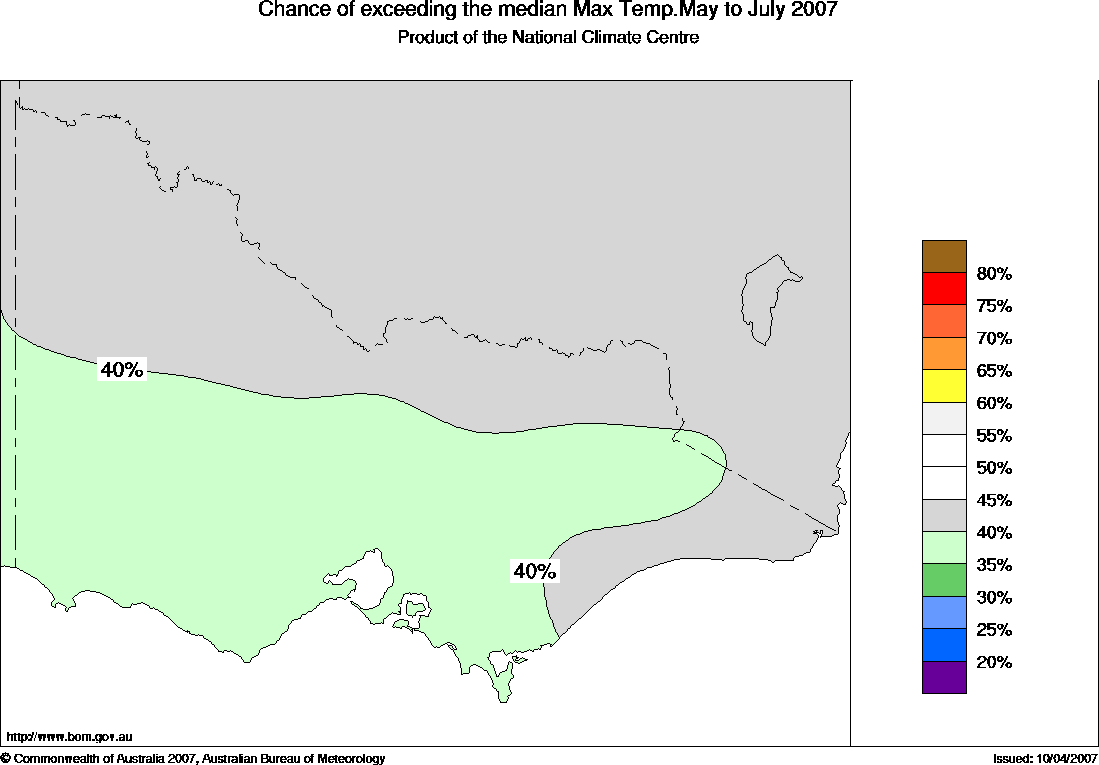 Vic Seasonal Temperature Outlook: probabilities for May to July 2007, issued 23rd April 2007 | ||||