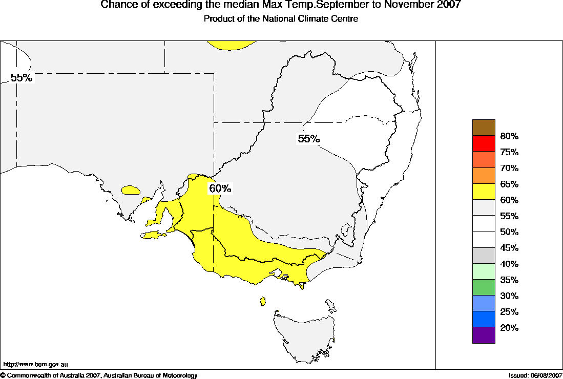 Warmer spring favoured in parts of SE AustraliaThe outlook for maximum temperatures in southeastern Australia averaged over spring (September to November) shows a moderate shift in the odds favouring higher than average temperatures across Victoria and parts of South Australia.