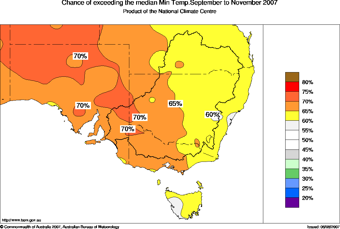Southeastern Aust Seasonal Temperature Outlook: probabilities for Spring 2007, issued 23rd August 2007 | |||||||||||