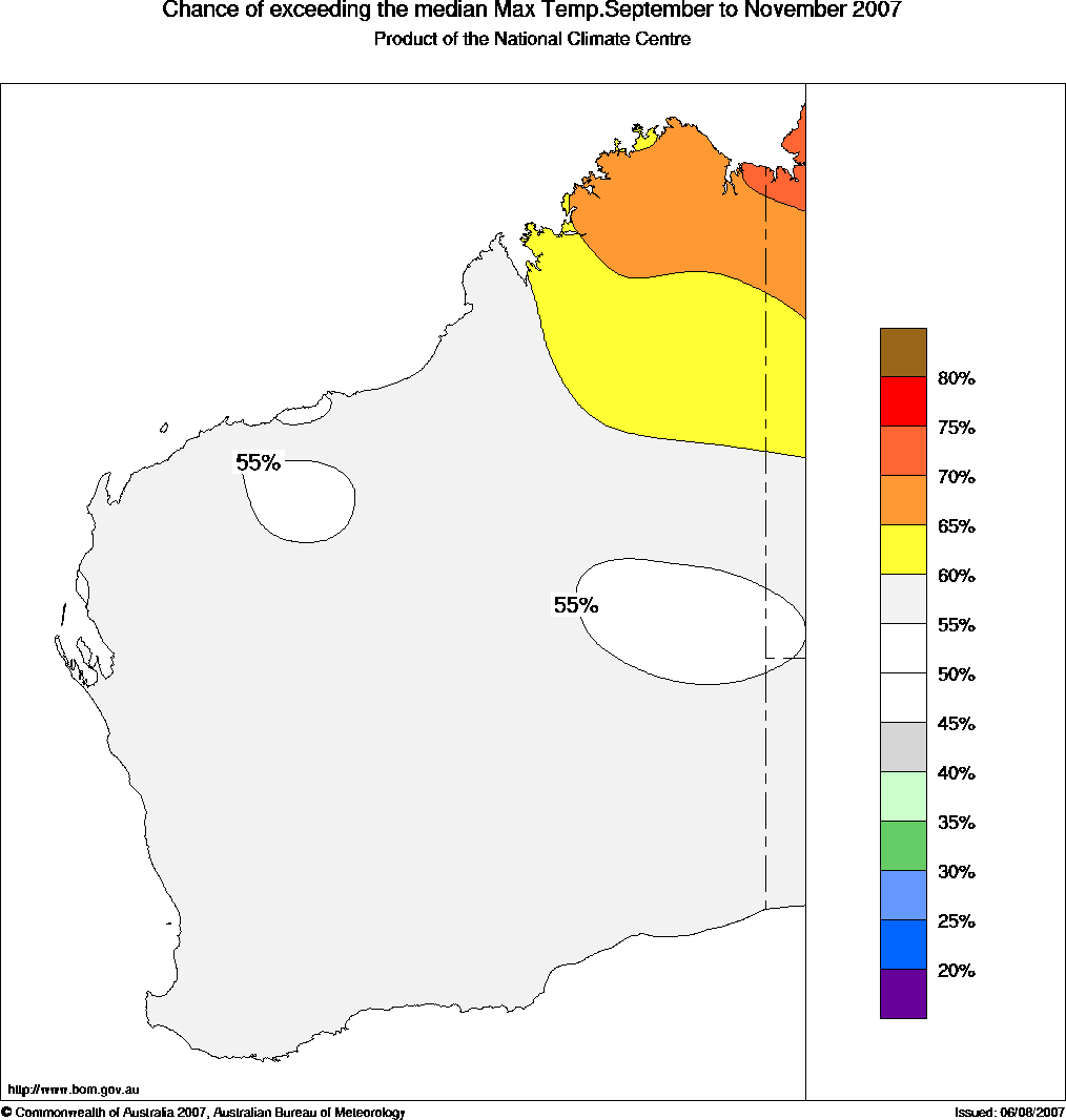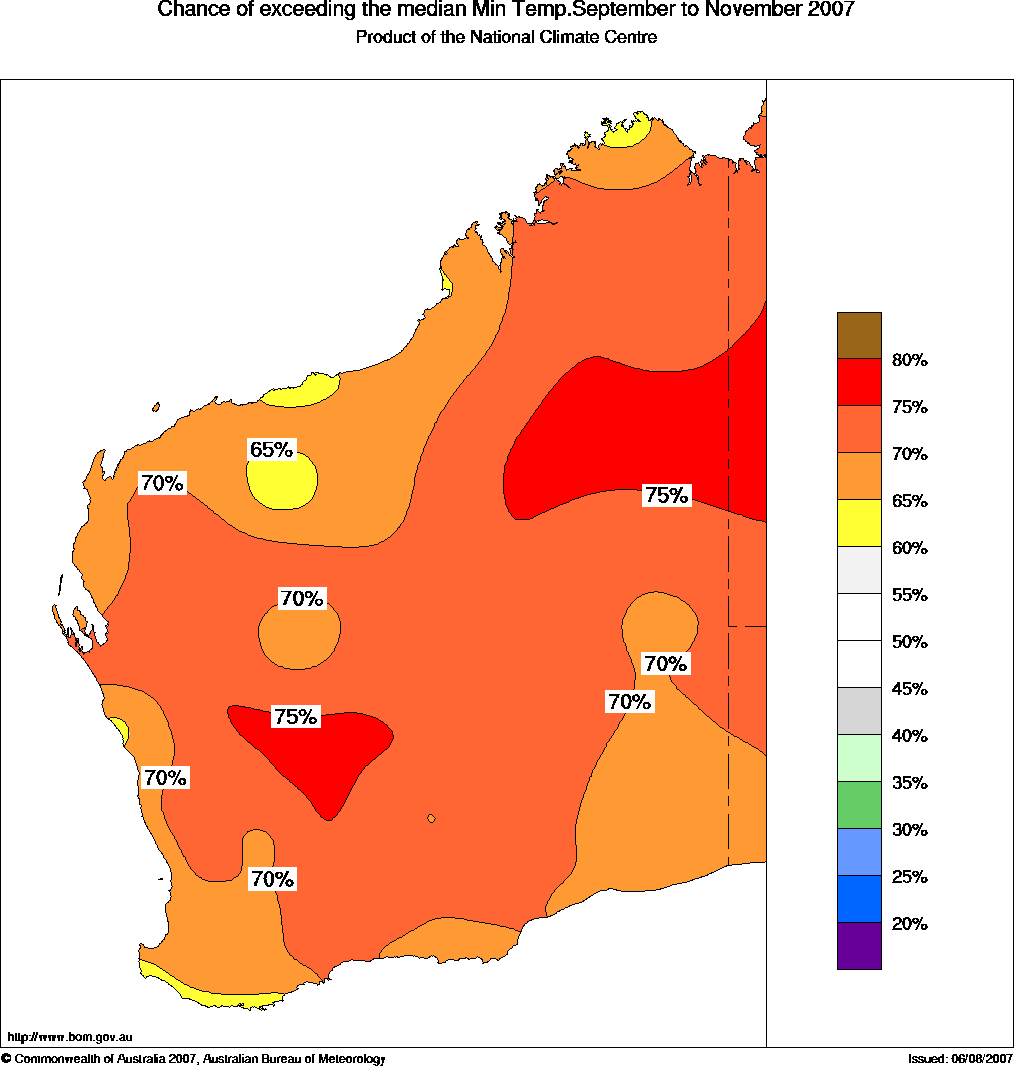 WA Seasonal Temperature Outlook: probabilities for Spring 2007, issued 23rd August 2007 | ||||