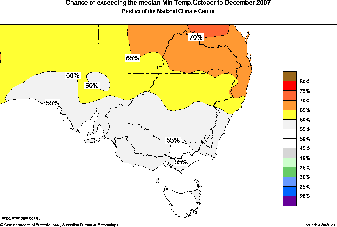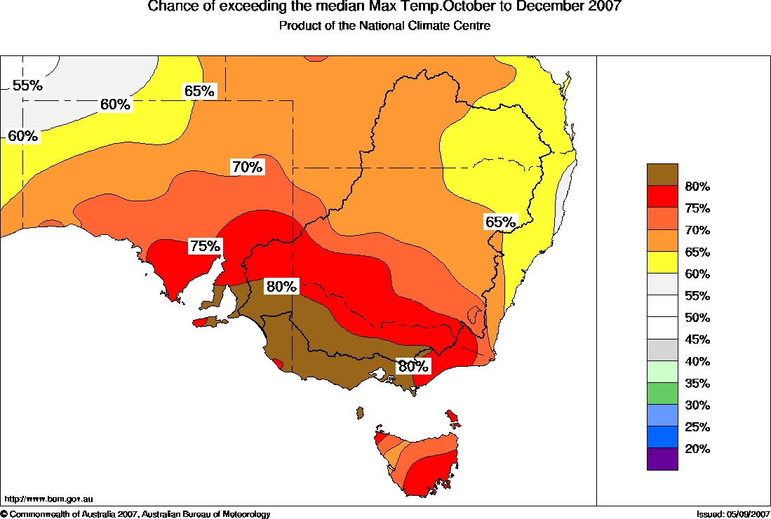 Southeastern Aust Seasonal Temperature Outlook: probabilities for October to December 2007, issued 25th September 2007 | |||||||||||