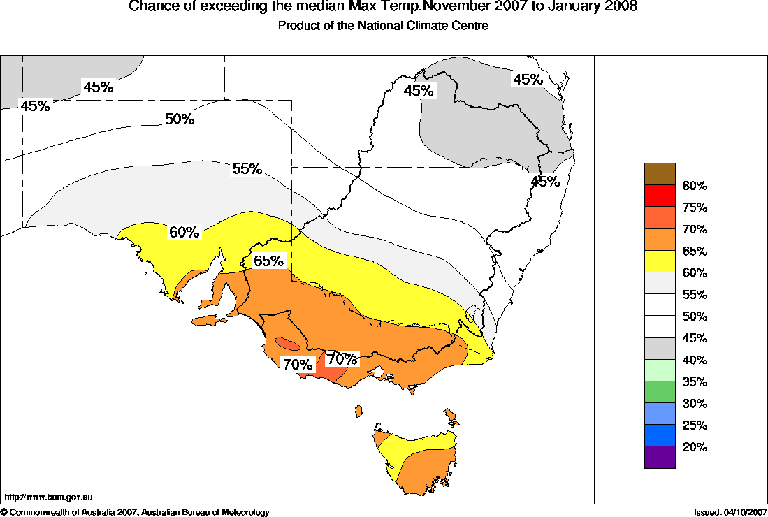 Southeastern Aust Seasonal Temperature Outlook: probabilities for November 2007 to January 2008, issued 25th October 2007 | |||||||||||
