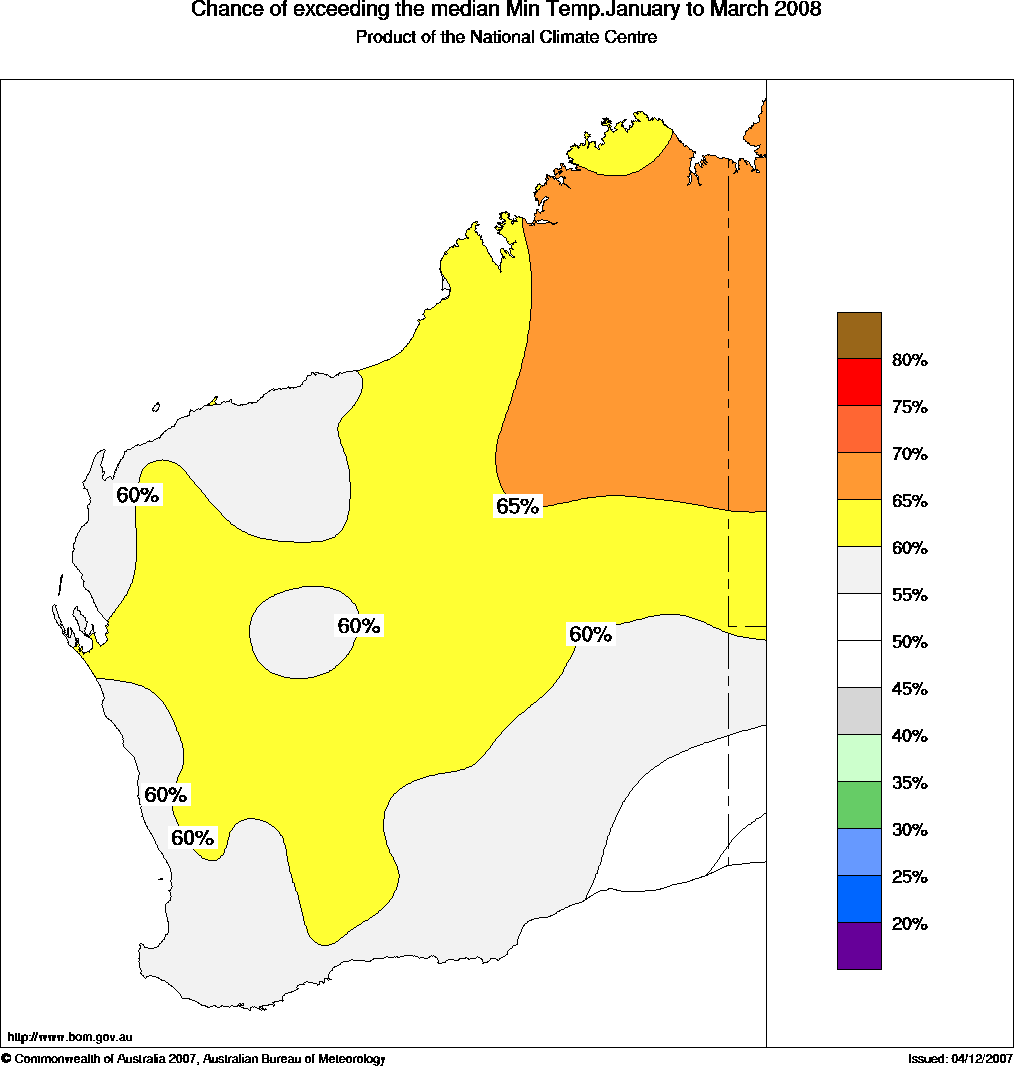WA Seasonal Temperature Outlook: probabilities for January to March 2008, issued 17th December 2007 | ||||