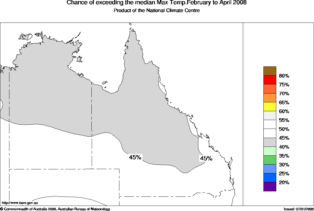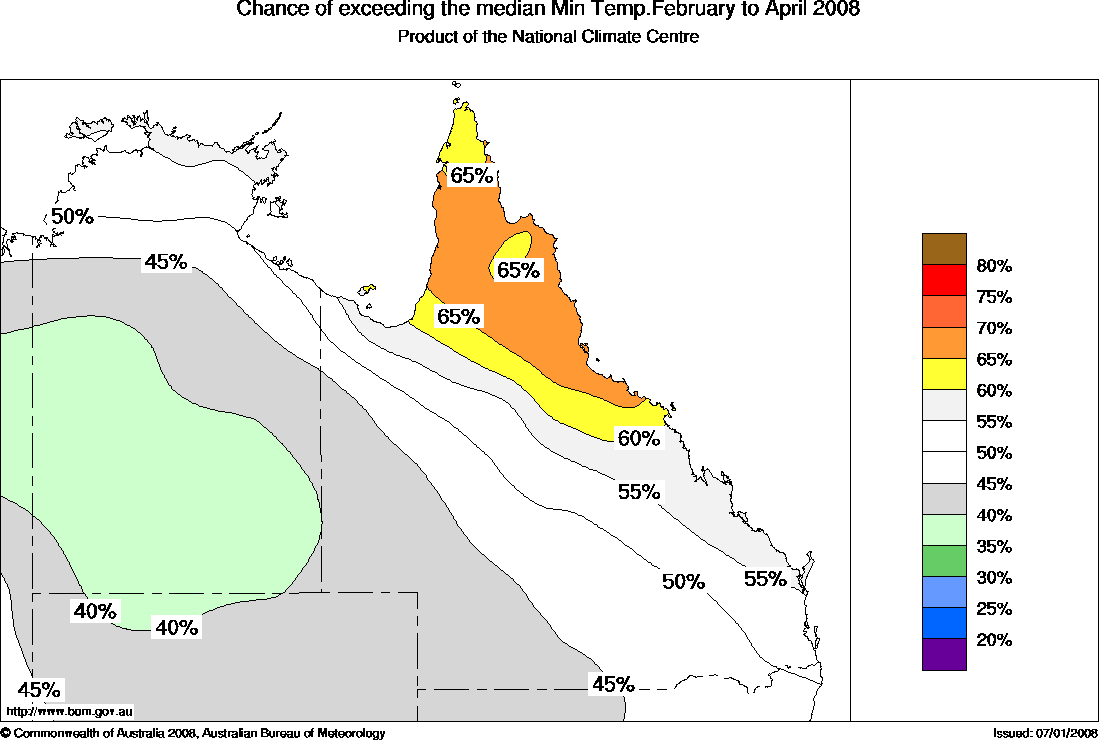 Warm nights favoured in northeast AustraliaThe northern Australian outlook over the last three months of the wet season (February to April) shows an increased chance of warmer nights in northern Queensland. Maximum temperatures have a 50:50 chance of exceeding the median.