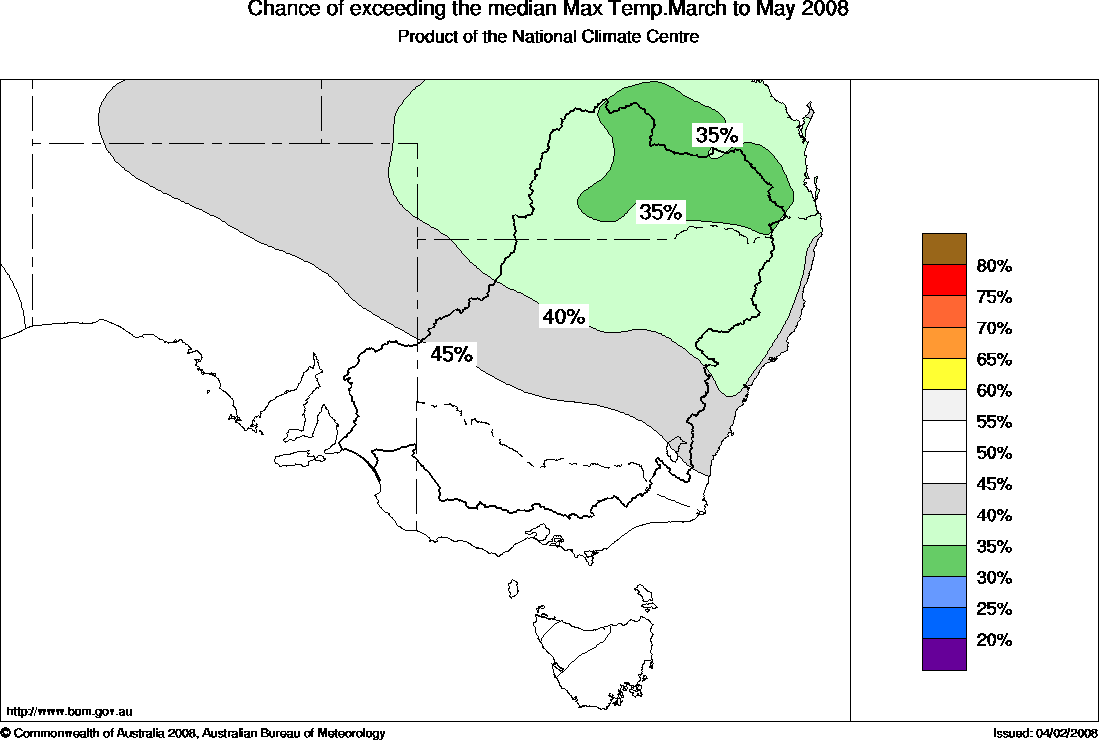 Southeastern Aust Seasonal Temperature Outlook: probabilities for Autumn 2008, issued 26th February 2008 | |||||||||||