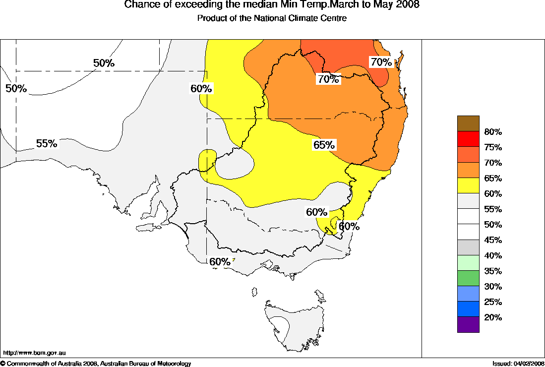 Cooler autumn days and warmer nights favoured in parts of NSWFor southeastern Australia the outlook for average autumn maximum temperatures (March to May) shows a moderate shift in the odds favouring cooler than normal conditions in northern NSW. In contrast the outlook for autumn minimum temperatures shows a shift in the odds towards warmer nights in NSW.