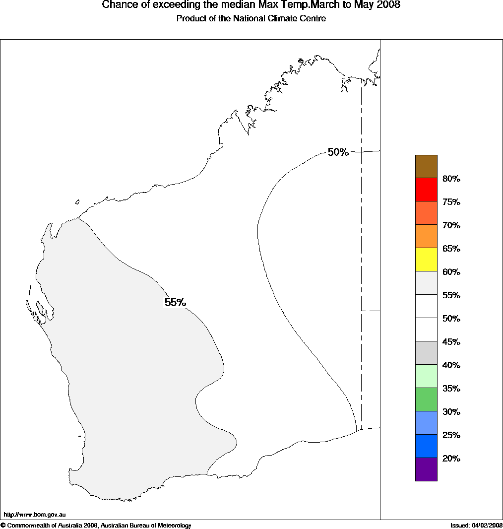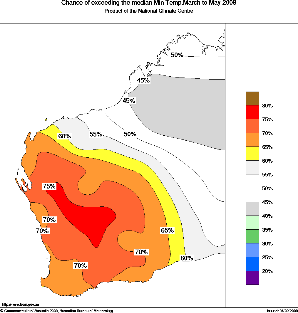 WA Seasonal Temperature Outlook: probabilities for Autumn 2008, issued 26th February 2008 | ||||