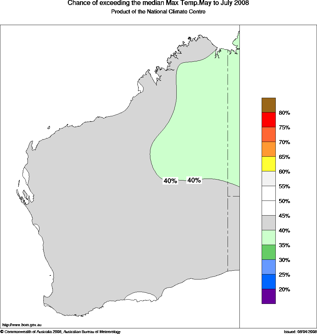 WA Seasonal Temperature Outlook: probabilities for May to July 2008, issued 23rd April 2008 | ||||