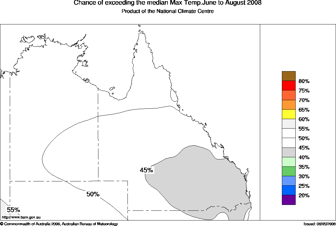 Northern Aust Seasonal Temperature Outlook: probabilities for Winter 2008, issued 27th May 2008 | |||||