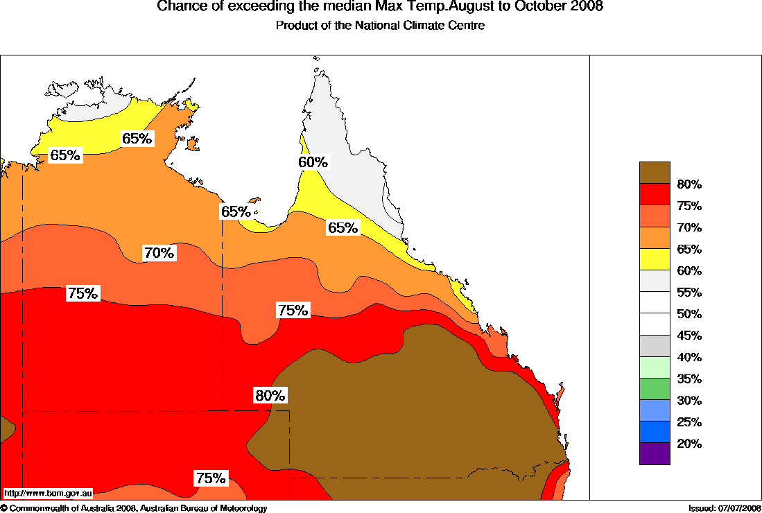 Northern Aust Seasonal Temperature Outlook: probabilities for August to October 2008, issued 25th July 2008 | |||||