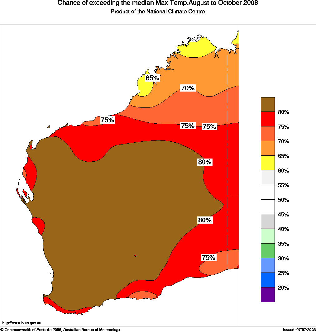 WA Seasonal Temperature Outlook: probabilities for August to October 2008, issued 25th July 2008 | ||||