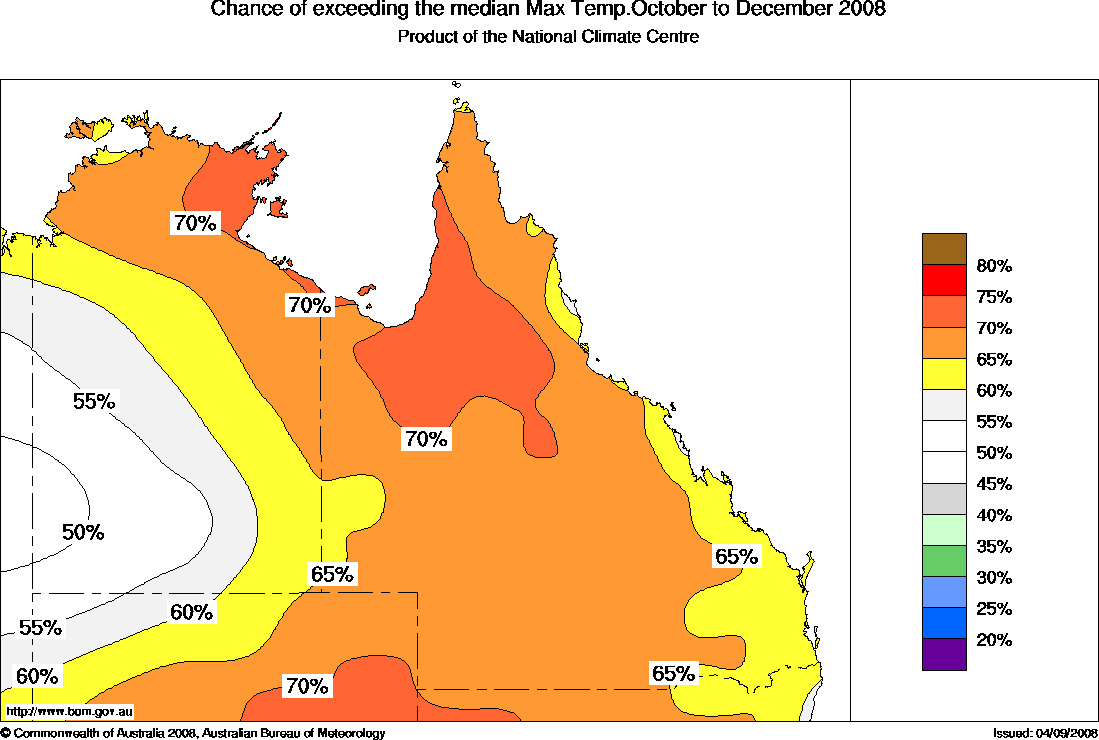 A warmer end to 2008 for northern AustraliaThe national outlook for average December quarter (October to December) maximum temperatures shows a moderate to strong shift in the odds favouring warmer than normal conditions over much of northern and eastern Australia. Warmer nights are also more likely over northern parts.