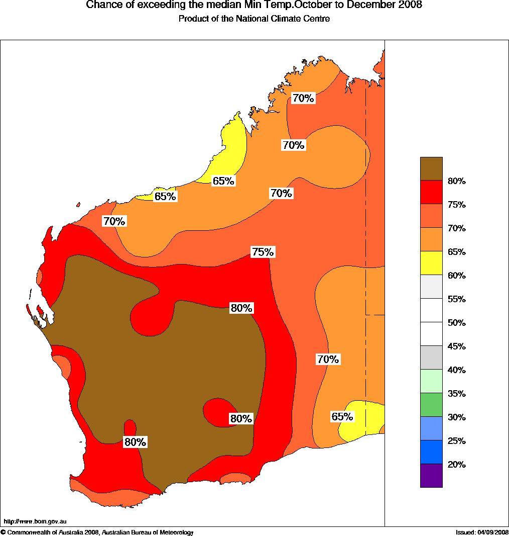 WA Seasonal Temperature Outlook: probabilities for October to December 2008, issued 25th September 2008 | ||||