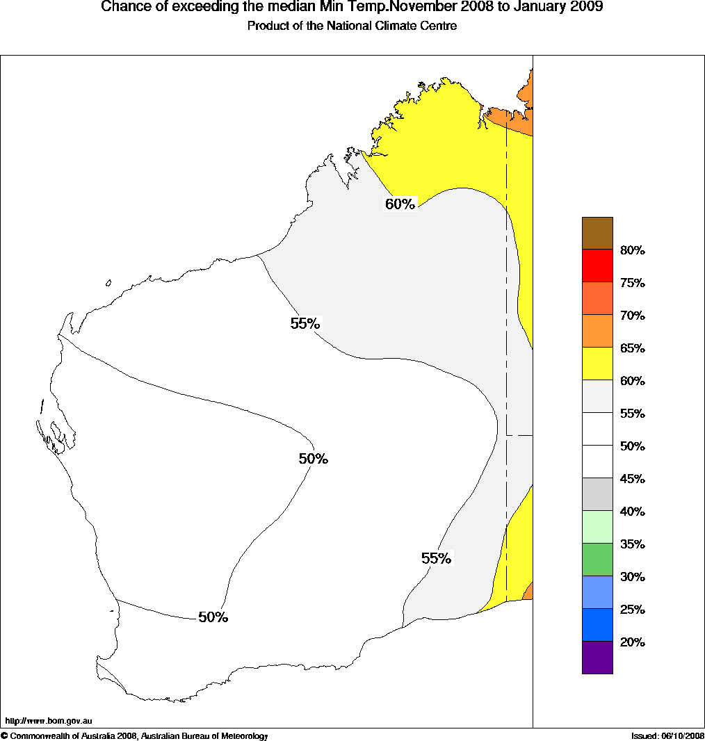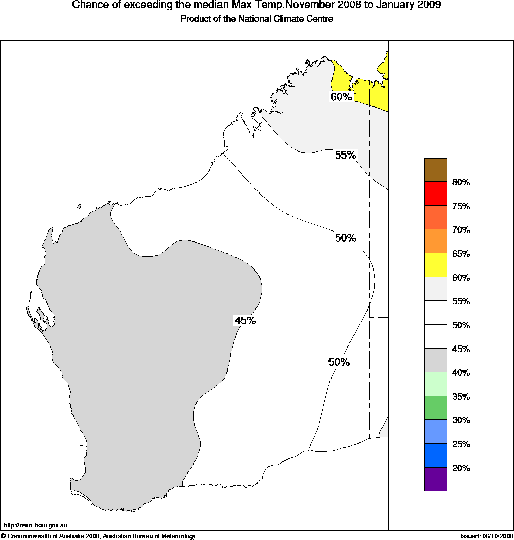WA Seasonal Temperature Outlook: probabilities for November 2008 to January 2009, issued 28th October 2008 | ||||