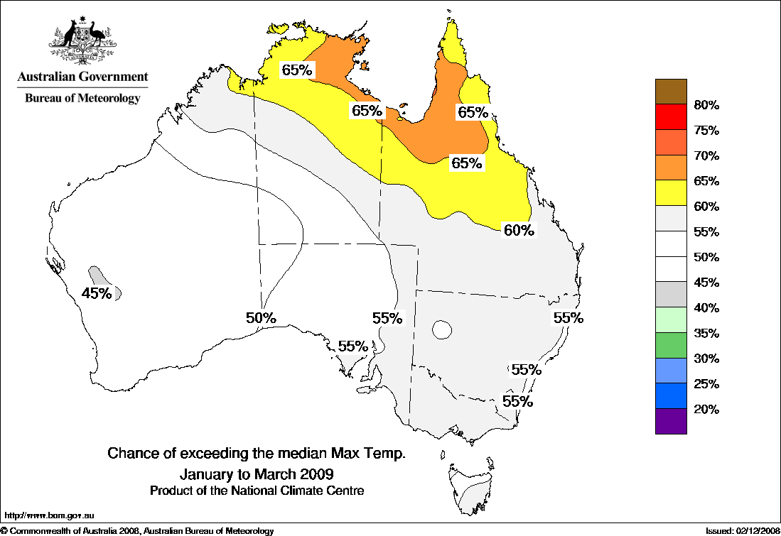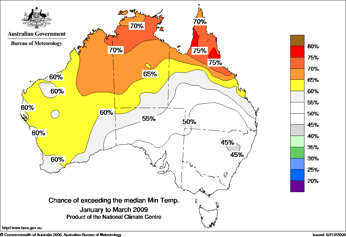 Warmer than normal March quarter favoured in the tropicsThe national outlook for daytime temperatures averaged over the March quarter (January to March) shows a moderate shift in the odds favouring warmer than normal conditions over the tropical north. Overnight temperatures are also likely to be higher than normal in the tropical north, as well as for most of the rest of WA.