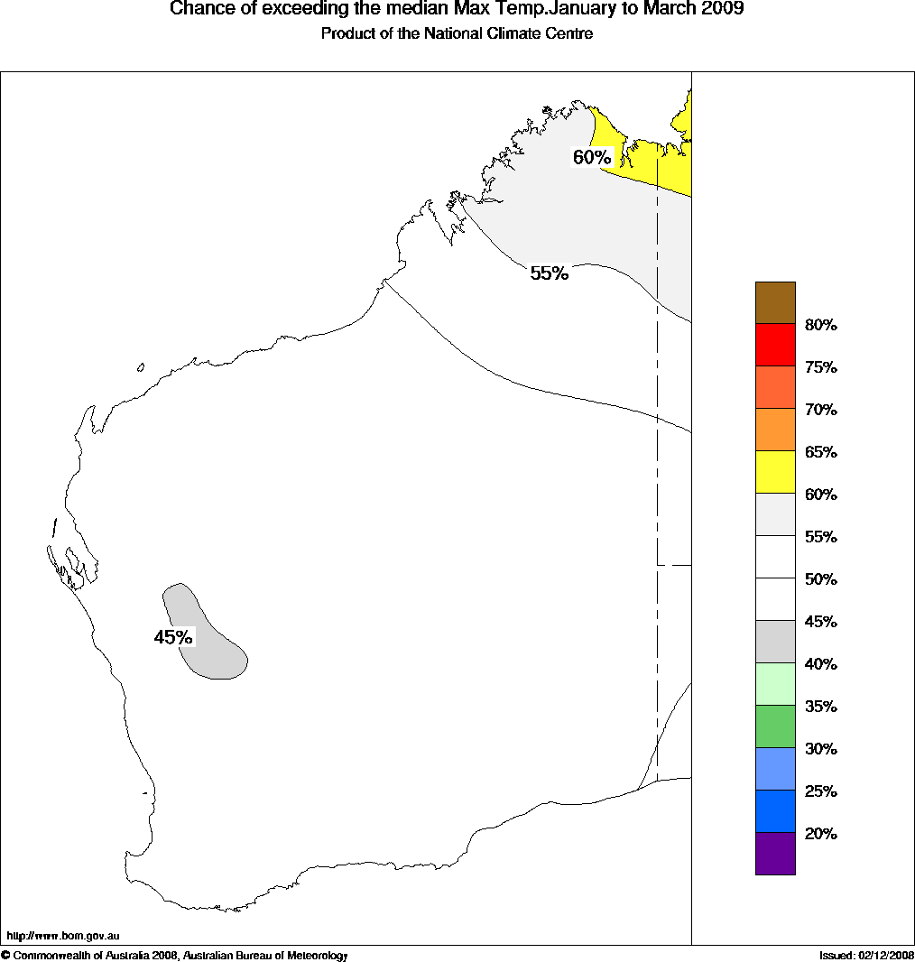 WA Seasonal Temperature Outlook: probabilities for January to March 2009, issued 17th December 2008 | ||||