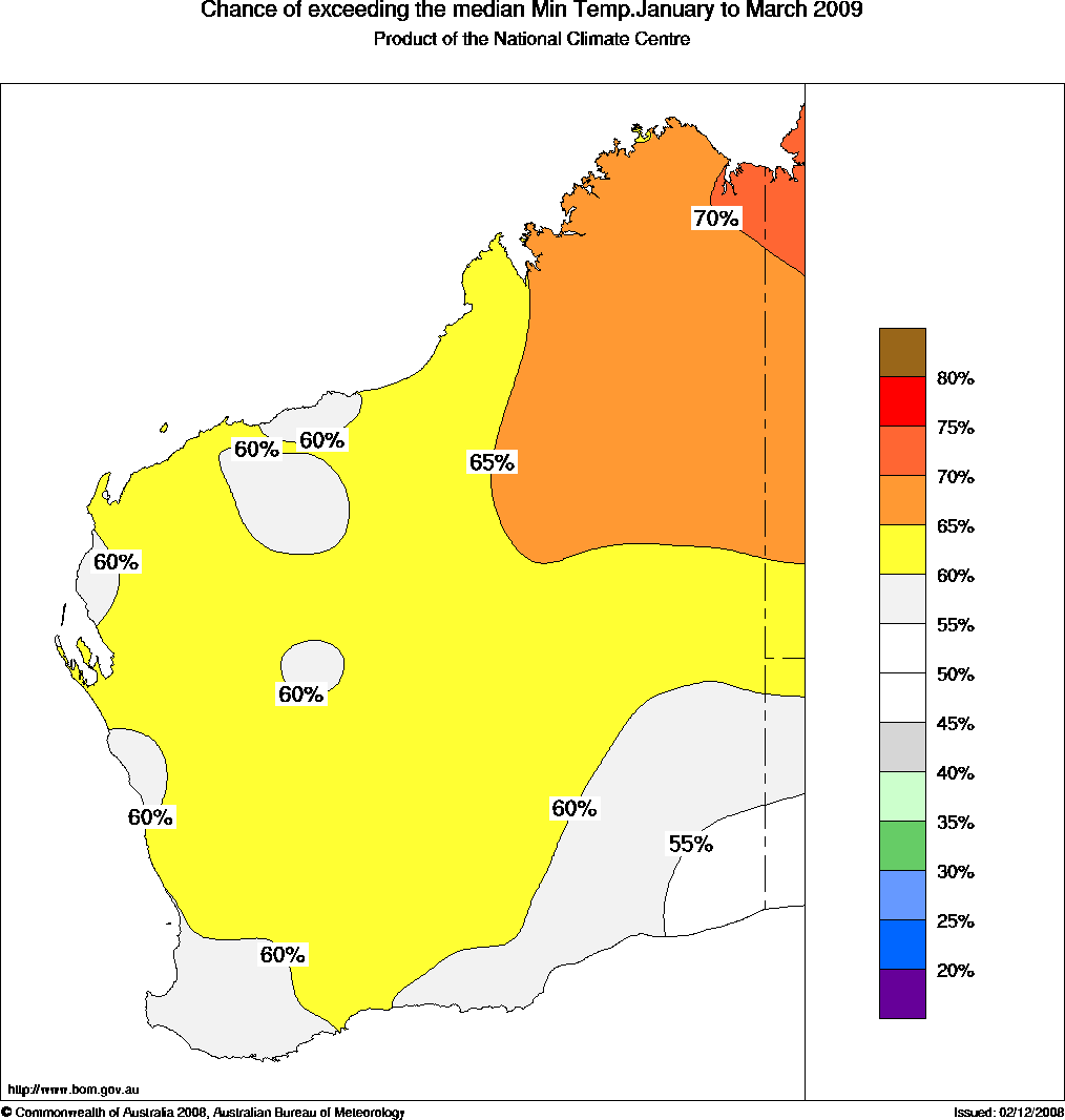 Warmer than normal nights favoured in WAThe WA outlook for daytime temperatures averaged over the March quarter (January to March) shows roughly equal chances of warmer or cooler than normal conditions across WA, whilst overnight temperatures are more likely to be warmer than normal for most of WA.