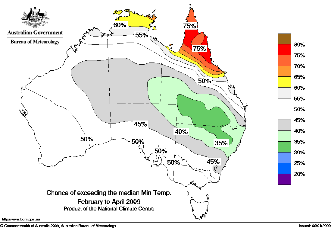 Warmer than normal late summer to mid-autumn favoured in northeast AustraliaThe national outlook for daytime temperatures averaged over late summer to mid-autumn (February to April) shows a moderate to strong shift in the odds favouring warmer than normal daytime temperatures over the tropical north, with a moderate shift in the odds towards cooler temperatures over central WA. Overnight temperatures also show mixed odds, with higher than normal temperatures more likely in northern Queensland and the NT and cooler temperatures more likely in southern Queensland into northern NSW.