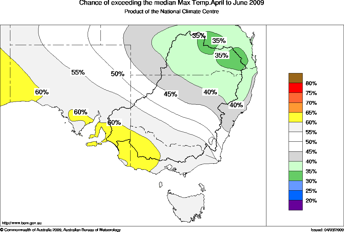 Southeastern Aust Seasonal Temperature Outlook: probabilities for April to June 2009, issued 24th March 2009 | |||||||||