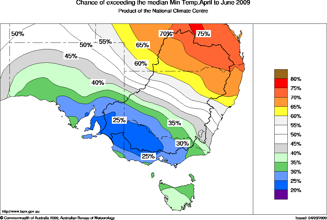 Cooler nights expected in southern parts of SE AustraliaFor southeastern Australia, the outlook for minimum temperatures averaged over the June quarter (April to June) shows a pattern of strongly contrasting probabilities. Moderate to strong shifts in the odds favour below normal overnight temperatures over the southern parts of the region, while warmer than normal temperatures are indicated in northeast NSW. Although not as strong, the outlook pattern for maximum temperatures is reversed, with warmer days favoured in parts of SA and Victoria and cooler days more likely in northeast NSW.