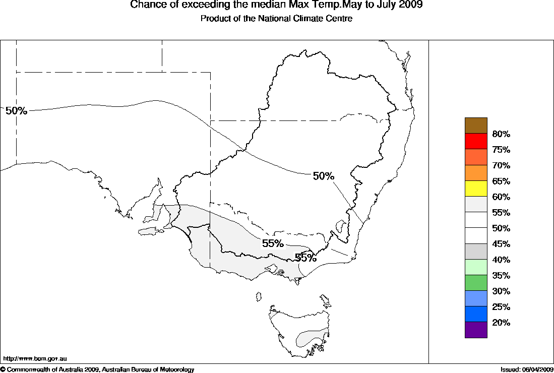 Southeastern Aust Seasonal Temperature Outlook: probabilities for May to July 2009, issued 24th April 2009 | |||||||||