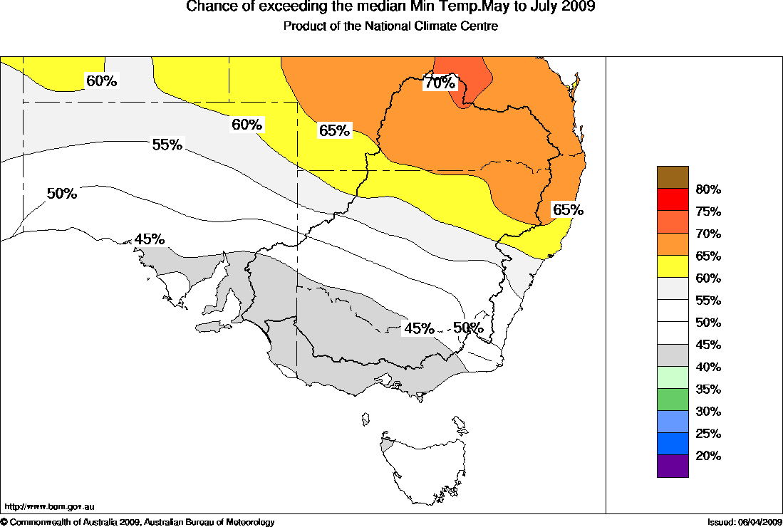 Warmer nights favoured in northern NSWFor southeastern Australia, the outlook for minimum temperatures averaged over the late autumn to mid-winter period (May to July) shows a moderate shift in the odds favouring above average temperatures over northern NSW. However, there are only weak shifts in the odds as far as daytime maximum temperatures are concerned.