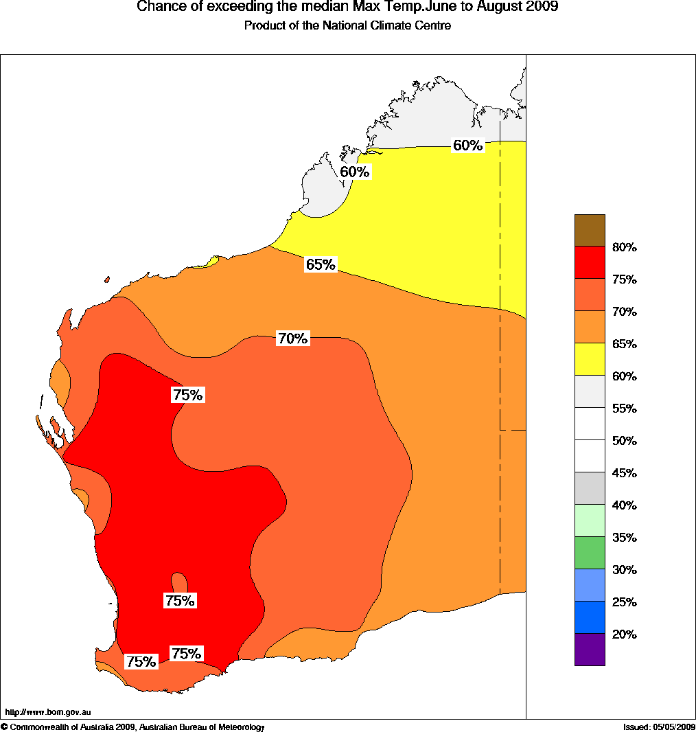 WA Seasonal Temperature Outlook: probabilities for Winter 2009, issued 26th May 2009 | ||||