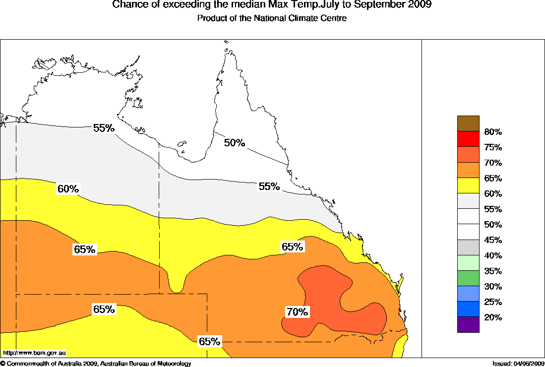 Warmer days favoured in the southThe northern Australian outlook for maximum temperatures averaged over the September quarter (July to September) shows warmer than normal days are favoured for the southern half of Queensland and the Northern Territory.