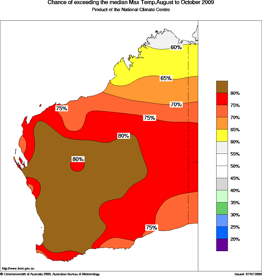 A warmer than normal season likely in Western AustraliaThe WA outlook for maximum temperatures averaged over late winter to mid-spring (August to October), shows that warmer than normal days are favoured for most of the state.