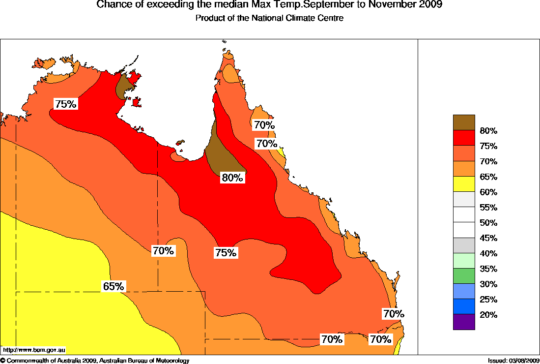 Warmer than normal spring indicated for northern AustraliaThe northern Australian outlook for maximum temperatures averaged over spring (September to November), shows a moderate to strong bias in the odds favouring warmer than average conditions.