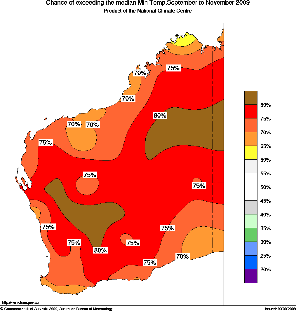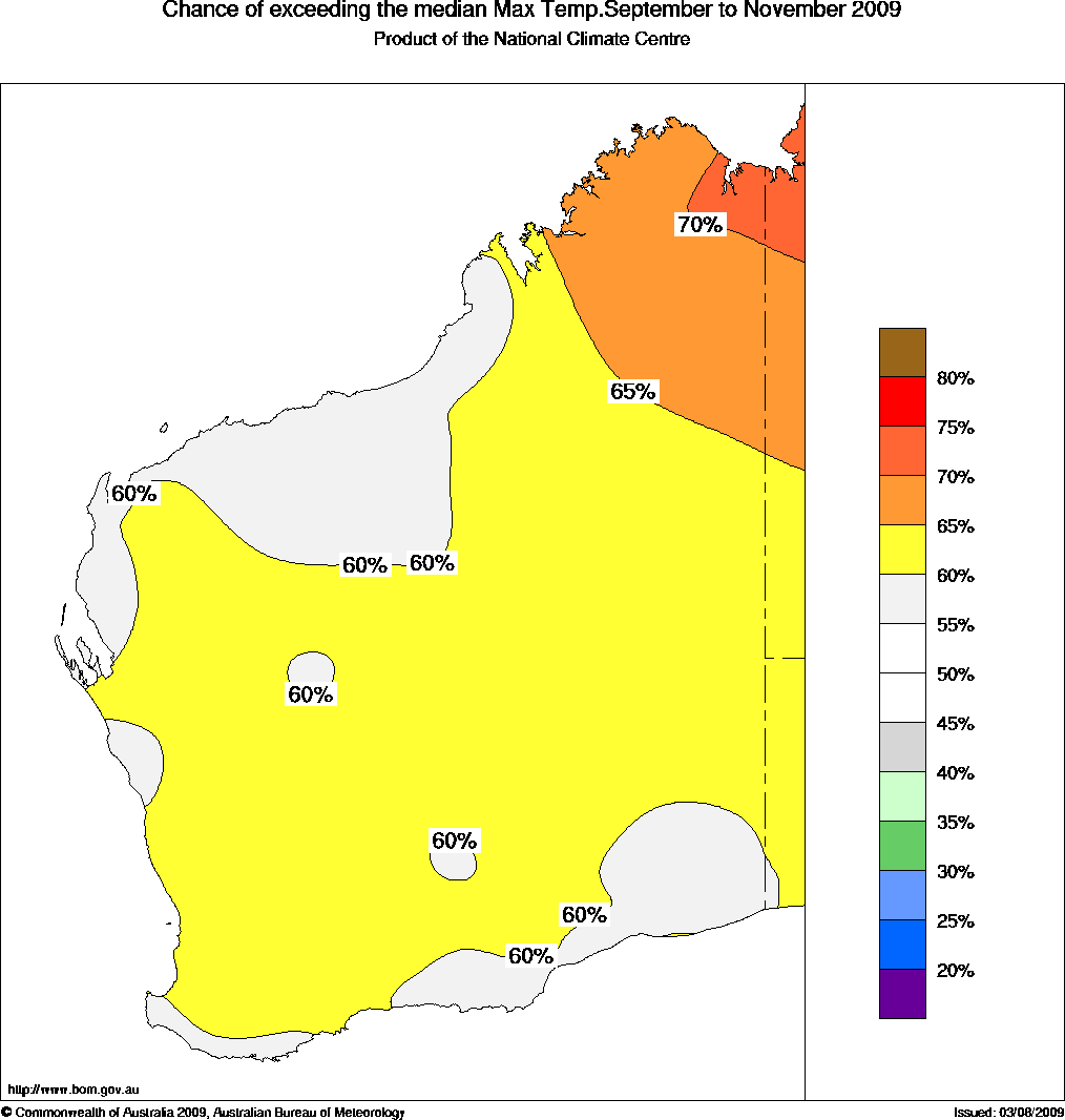 WA Seasonal Temperature Outlook: probabilities for Spring 2009, issued 26th August 2009 | ||||