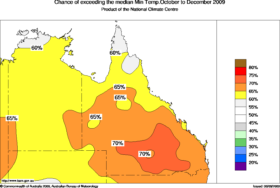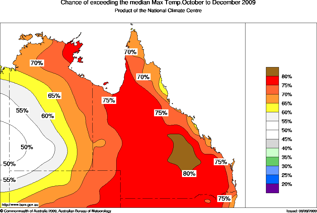 Northern Aust Seasonal Temperature Outlook: probabilities for October to December 2009, issued 22nd September 2009 | |||||
