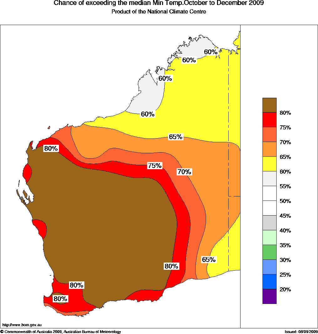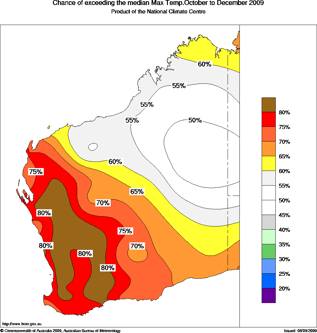 WA Seasonal Temperature Outlook: probabilities for October to December 2009, issued 22nd September 2009 | ||||