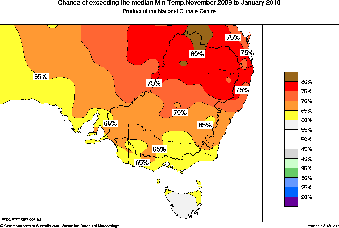 Warmer nights favoured for SE AustraliaThe outlook for temperatures over the November to January period shows warm nights are more likely than cool across southeast Australia with the exception of Tasmania. Warmer daytime temperatures are also favoured for much of southeast Australia, although not as strongly.