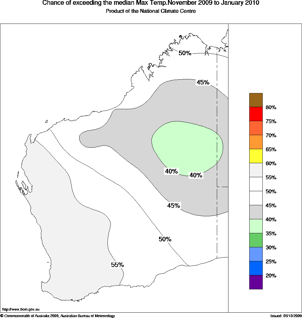 WA Seasonal Temperature Outlook: probabilities for November 2009 to January 2010, issued 23rd October 2009 | ||||